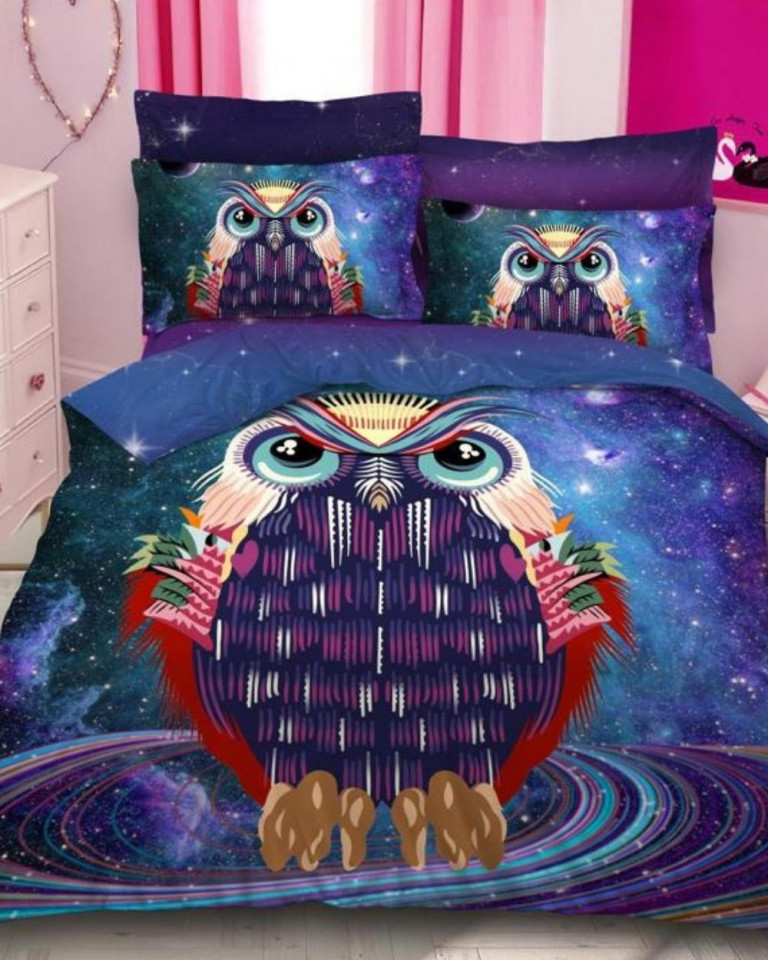 Lenjerie de pat cu 2 fete, imprimeu 3D, tesatura tip finet, pat 2 persoane, albastru / violet, 6 piese, A2-11