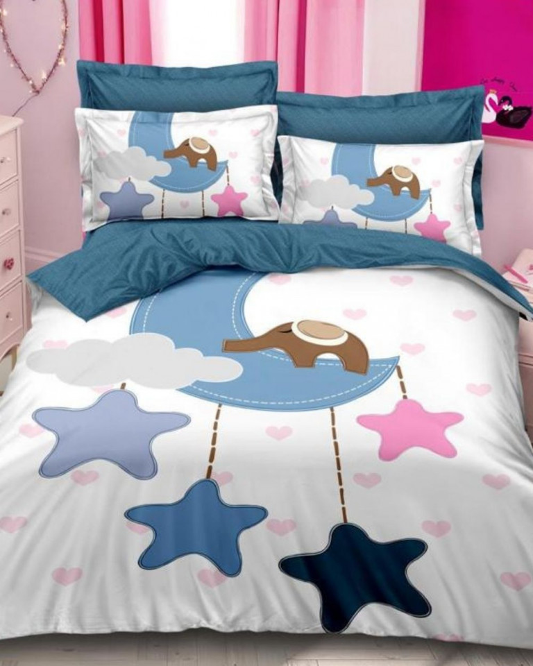 Lenjerie de pat cu 2 fete, imprimeu 3D, tesatura tip finet, pat 2 persoane, alb / albastru, 6 piese, A2-15