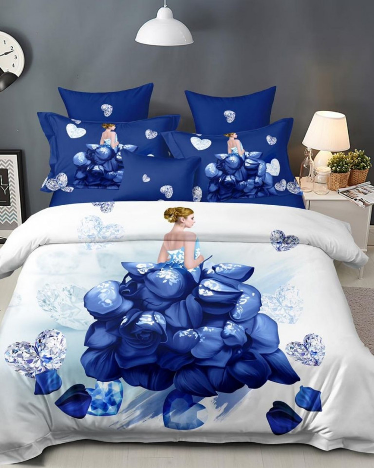 Lenjerie de pat cu 2 fete, imprimeu 3D, tesatura tip finet, pat 2 persoane, albastru / alb, 6 piese, A2-18