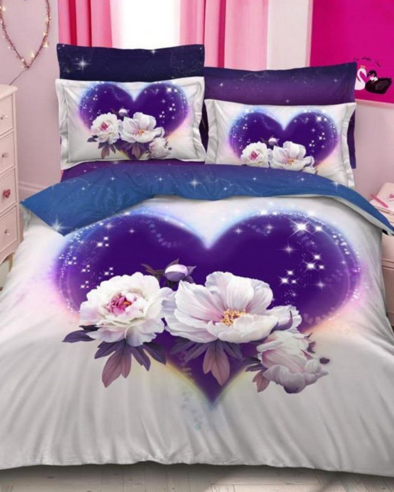 Lenjerie de pat cu 2 fete, imprimeu 3D, tesatura tip finet, pat 2 persoane, alb / violet, 6 piese, A2-29