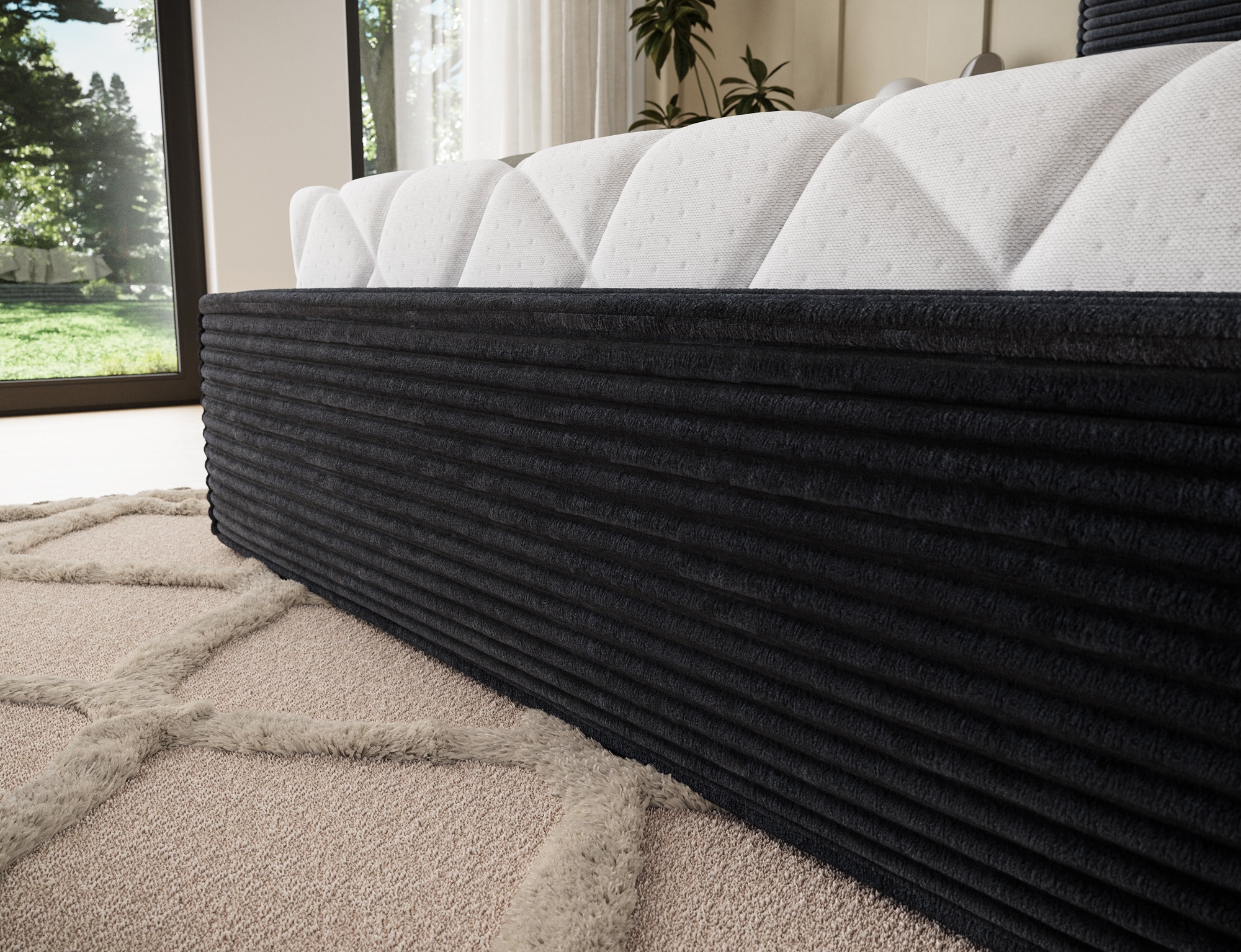 Modelul este echipat cu un compartiment generos pentru depozitarea lenjeriei, perfect pentru optimizarea spațiului și menținerea ordinii în dormitor. Picioarele negre din plastic rezistent completează armonios designul, adăugând stabilitate și o notă de rafinament discret.