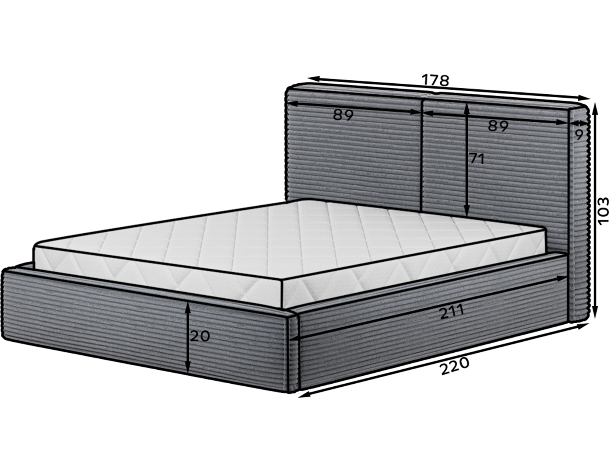 Cu o înălțime totală de 103 cm și o adâncime de 220 cm, patul impresionează prin proporții elegante și o construcție solidă. Umplutura din spumă T2130 oferă un nivel ridicat de confort și durabilitate, asigurând o susținere corectă și o senzație plăcută de relaxare în fiecare noapte.