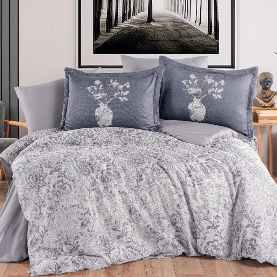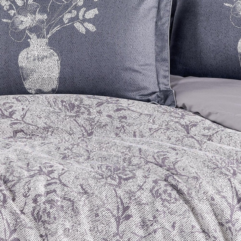 Compoziția cromatică gri antracit și gri deschis, împreună cu imprimeul floral, creează un decor modern și echilibrat. Modelul se potrivește în dormitoare amenajate în tonuri neutre și completează ușor atât mobilierul deschis, cât și pe cel în nuanțe închise.