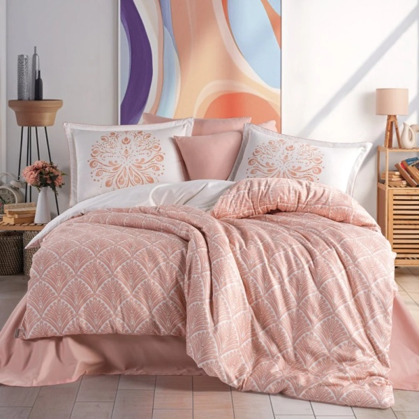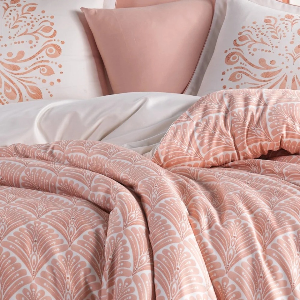 Imprimeul geometric, realizat în nuanțe calde de roz somon, creează un decor armonios și rafinat. Designul este ușor de integrat în dormitoare moderne, romantice sau elegante, adăugând un plus de căldură și stil spațiului de odihnă.